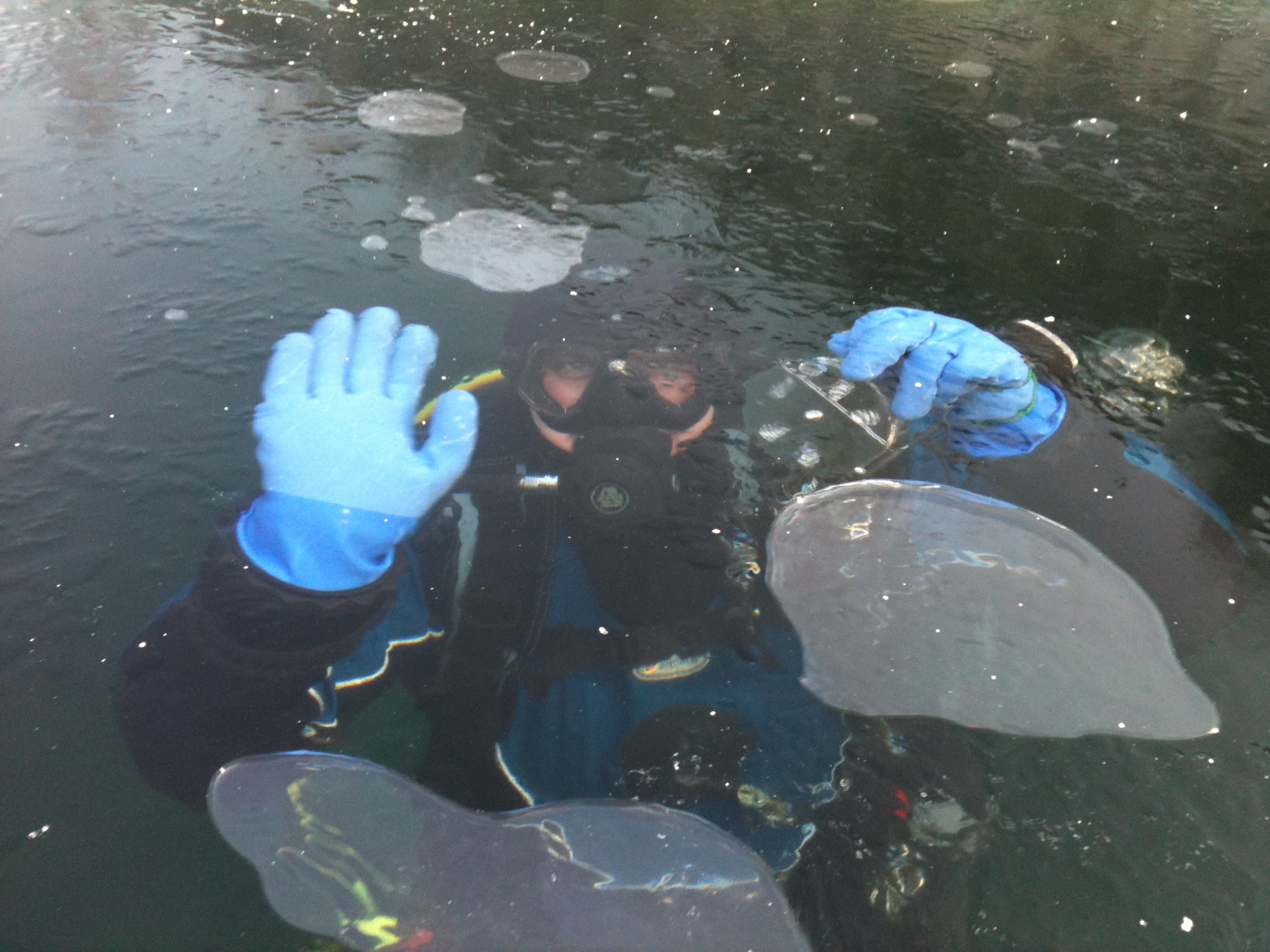 Lód ma jakieś 5-7cm i jest szkliście przejrzysty :) Można podziwiać widoki spod lodu i nurków pod stałą wodą! Rewelacja!